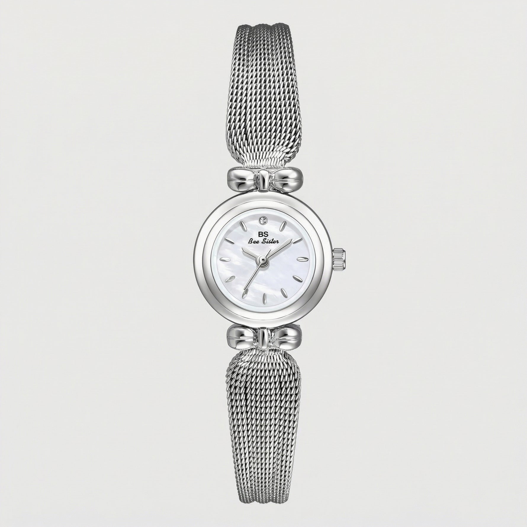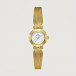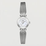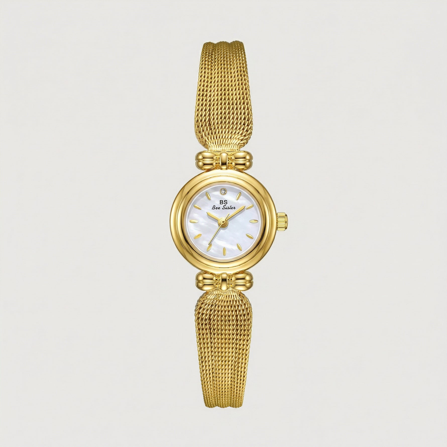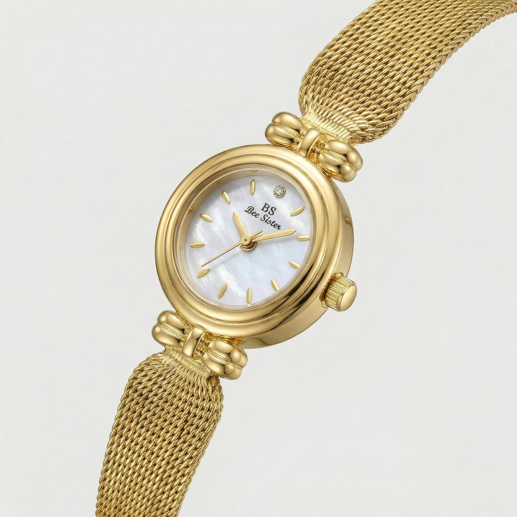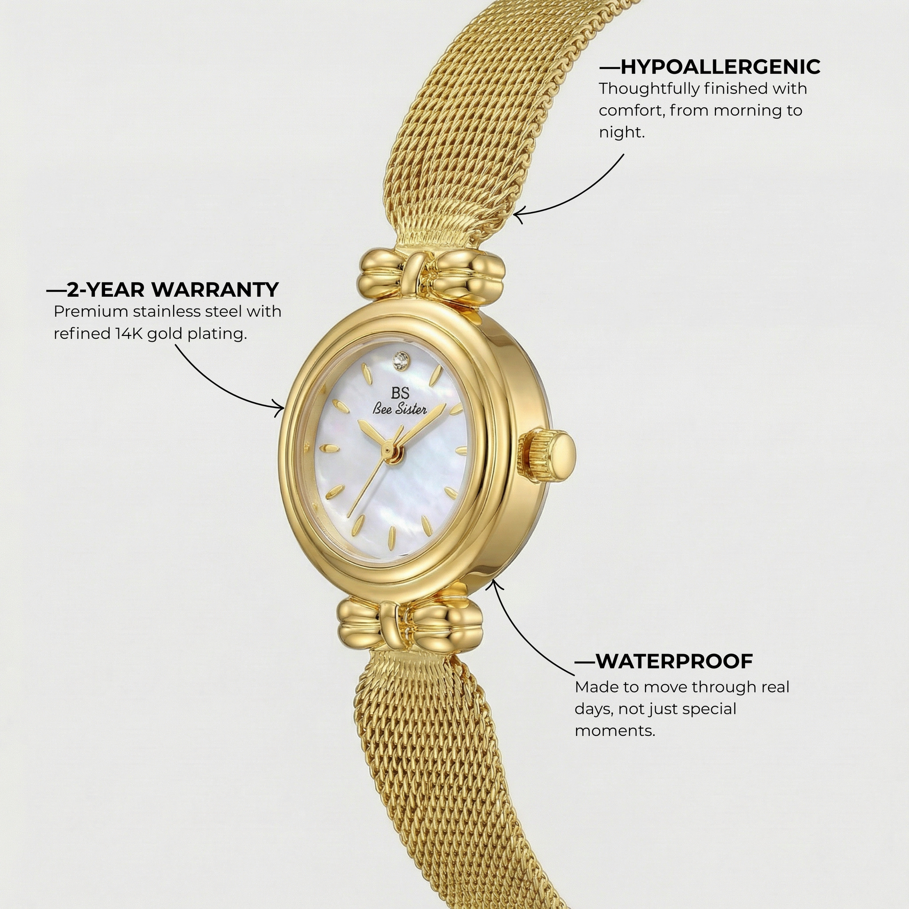 The Marielle Watch reflects graceful elegance with its delicate round dial and finely woven mesh bracelet. The soft shimmer of the dial paired with the fluid gold band creates a refined silhouette that feels both timeless and feminine. Subtle bow inspired accents connect the case to the bracelet, adding a charming touch that makes the design feel like a piece of jewelry.