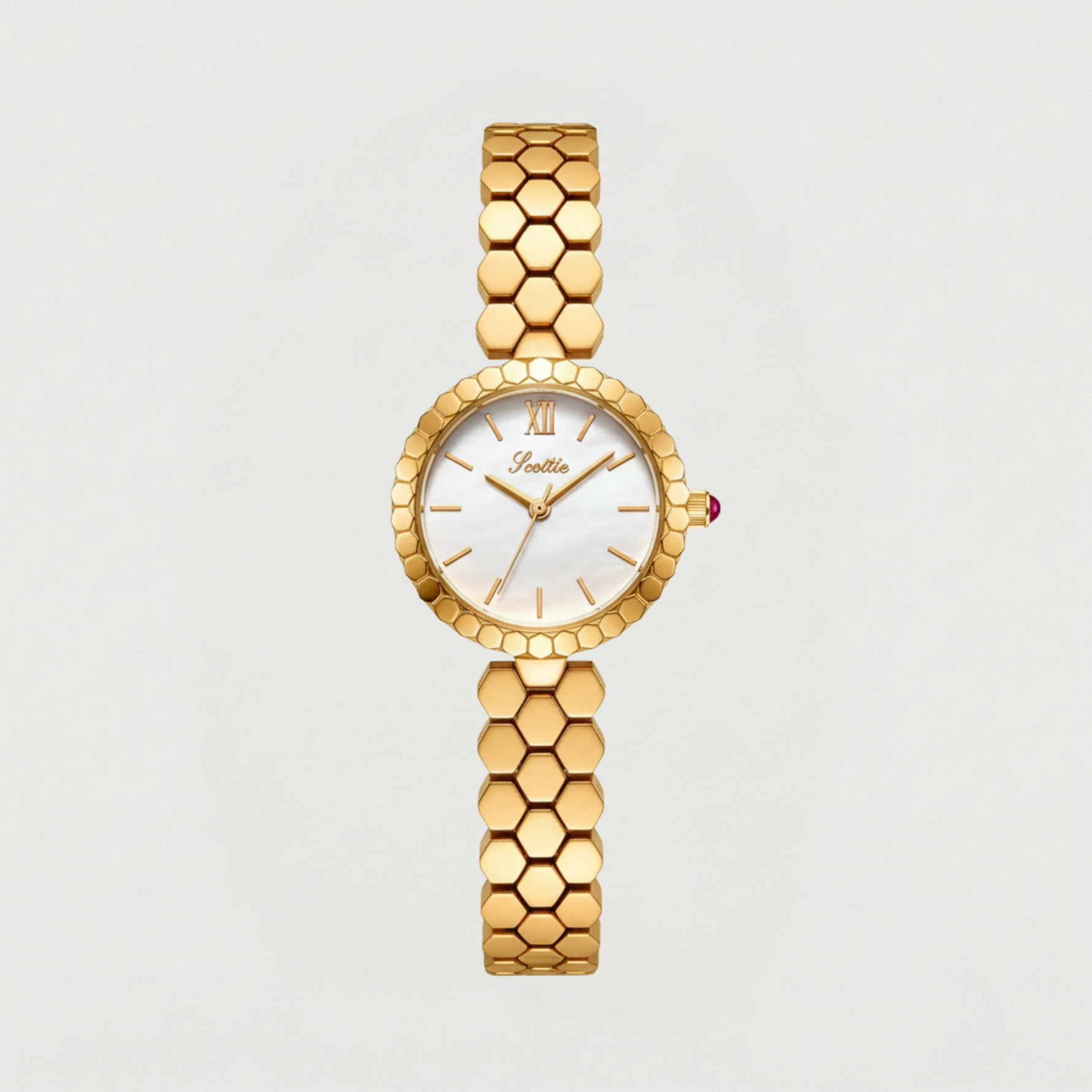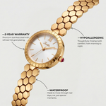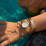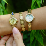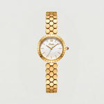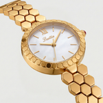The Lune Dorée Watch embodies timeless elegance with a delicate design inspired by the soft glow of moonlight. Its refined gold bracelet features a distinctive honeycomb pattern that creates a subtle play of light across the wrist, while the luminous dial adds a graceful and sophisticated touch. Elegant and effortlessly feminine, this piece blends classic charm with a modern jewelry-like aesthetic.