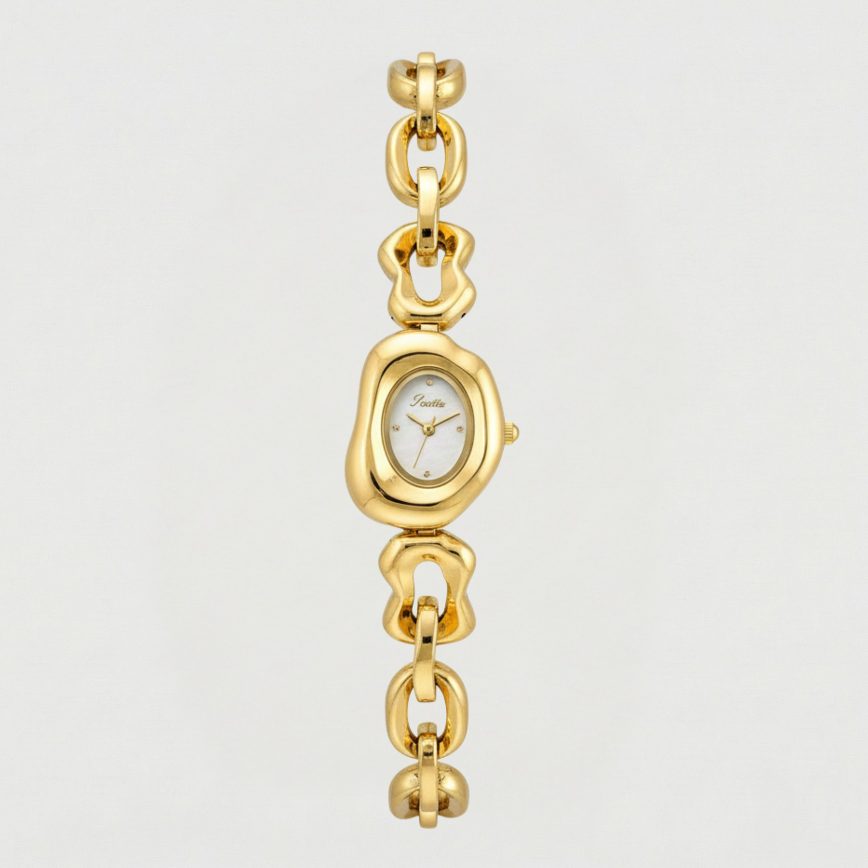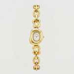 The Noéline Watch reflects soft elegance through its fluid, sculptural form and luminous gold finish. Its distinctive chain inspired bracelet is composed of smooth rounded links that create a graceful rhythm around the wrist, giving the piece a refined and expressive character. The gently curved oval case frames a delicate dial, adding a subtle vintage touch while maintaining a modern, minimalist aesthetic.