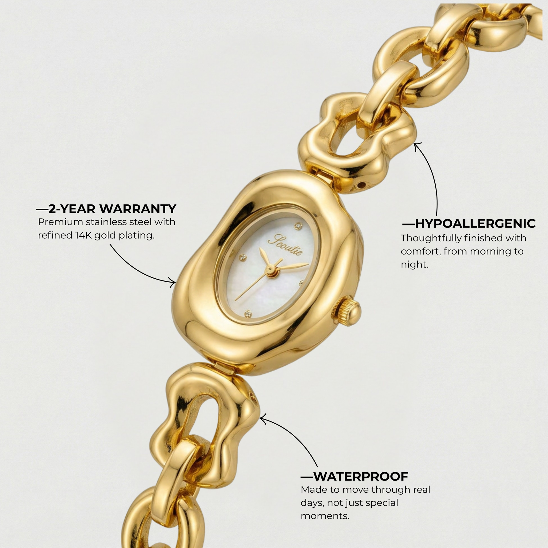 TooChérie watches are water-resistant, finished with scratch-resistant glass, and protected by our lifetime color guarantee.