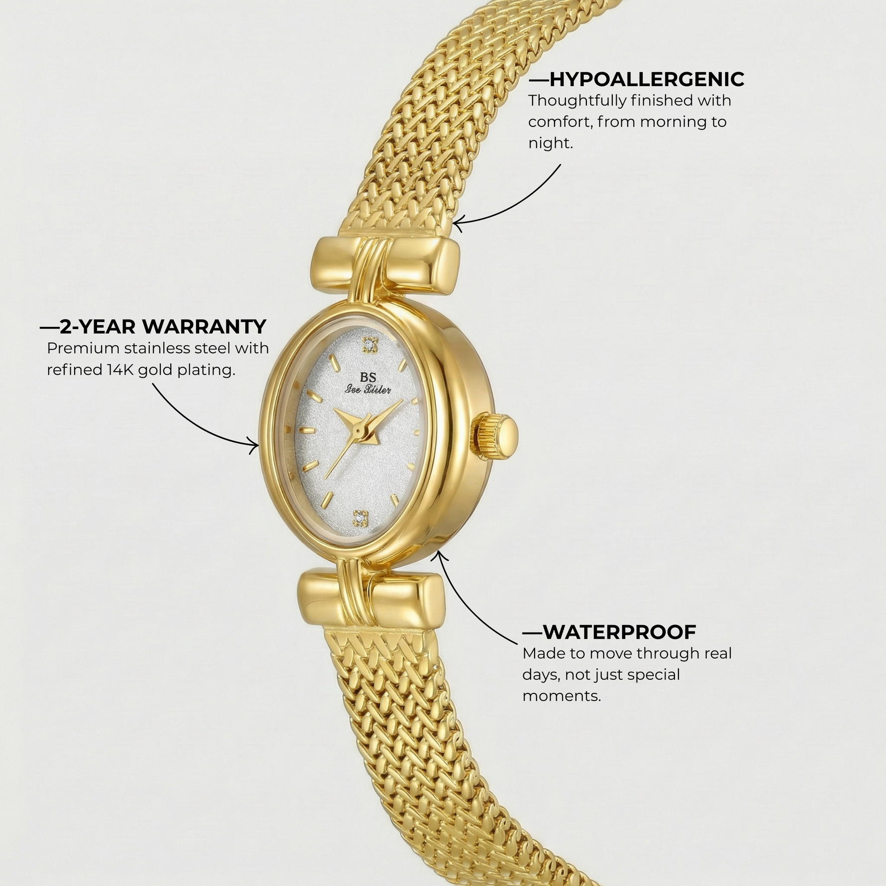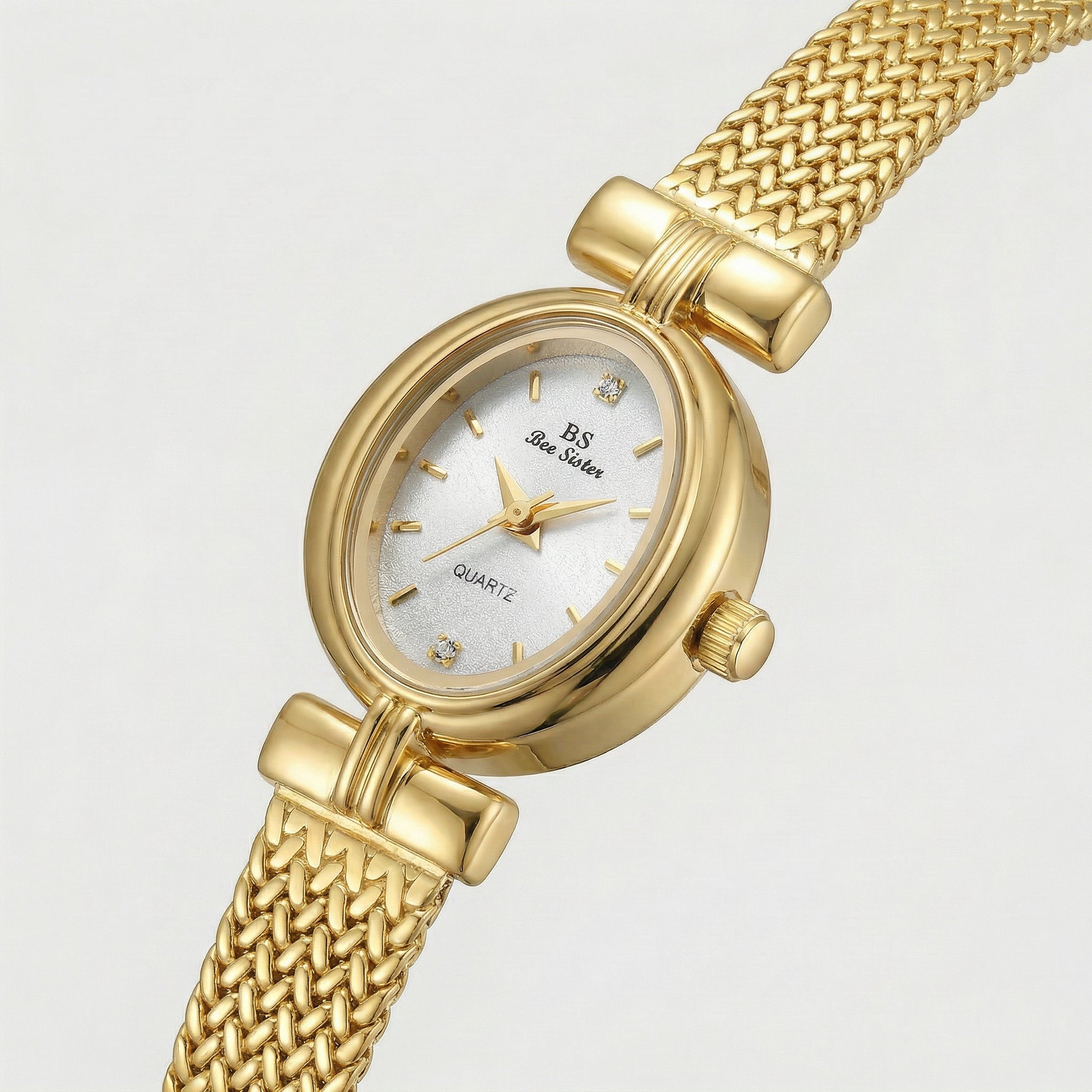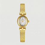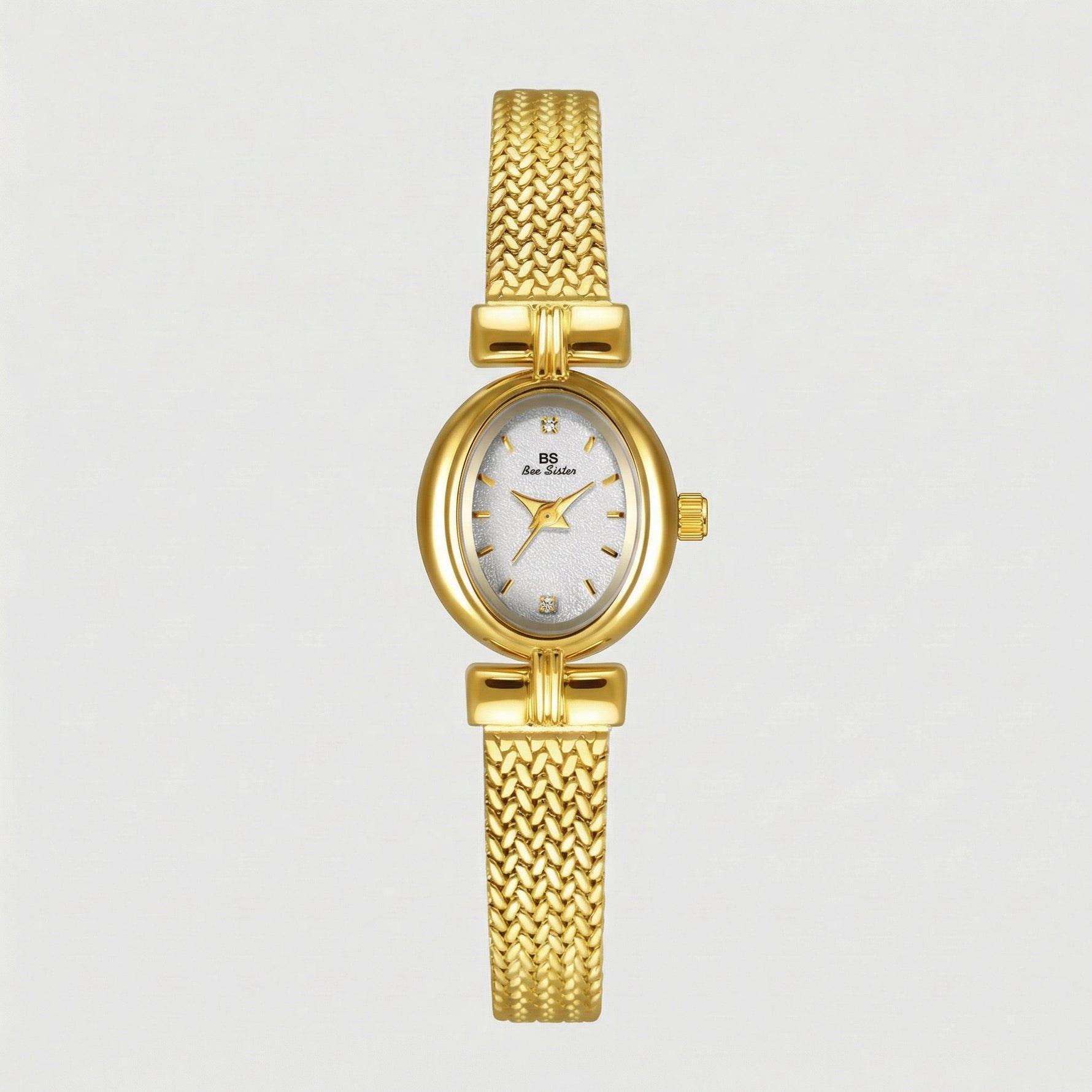 The Golden Heiress Watch radiates timeless elegance with its graceful oval dial and finely woven bracelet. The delicate mesh style band creates a fluid, jewelry like texture that catches the light beautifully, while subtle crystal accents on the dial add a refined sparkle. Sophisticated yet minimal, it brings a touch of quiet luxury to the wrist.